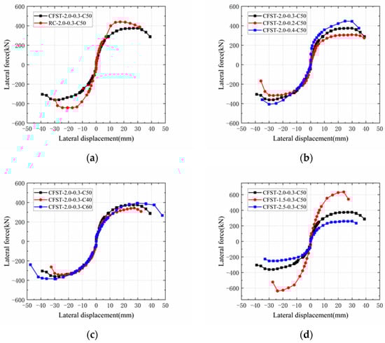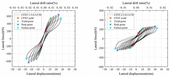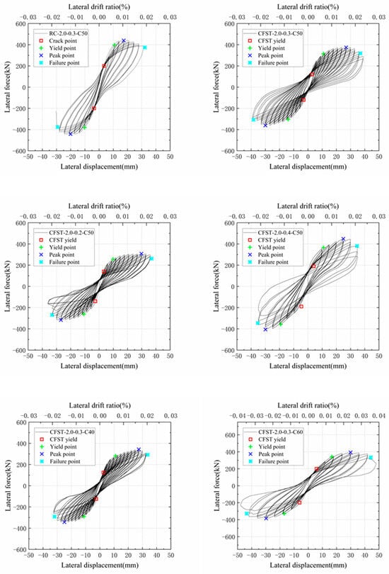Figure 8 shows the crack development of specimen CFST-2.0-0.3-C50. Horizontal cracks appeared on the lower left and right sides of the web at 12 mm of horizontal displacement. While at a displacement of 15 mm, vertical cracks emerged in the middle of the web, extending from top to bottom. As displacement increased, diagonal and vertical cracks became more pronounced. Concrete began to spall at a horizontal displacement of 30 mm (approximately H/50), and the bottom of the steel tube bulged and buckled (Figure 8d). Tearing occurred in the bulged region of the steel tube at a displacement of 40 mm (approximately H/30) (Figure 8f).