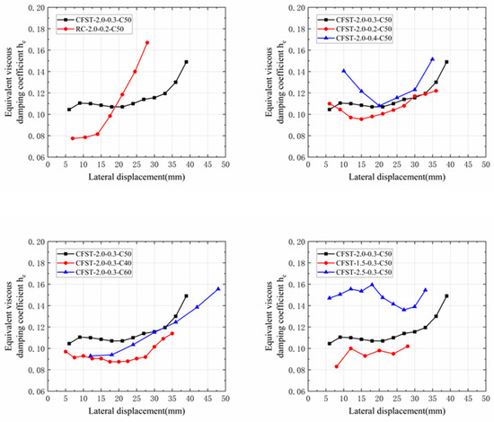 - The trends in the viscous damping coefficient for the three CRCSW-CFSTs with varying concrete strengths were similar. Both CFST-2.0-0.3-C40 and CFST-2.0-0.3-C50 showed comparable failure characteristics, leading to similar curves. In contrast, the failure of the CFST-2.0-0.3-C60 specimen was primarily due to the buckling and tearing of the bottom concrete-filled steel tube columns, which constrained the plastic energy dissipation capacity of the prefabricated web panels and resulted in the lowest value.