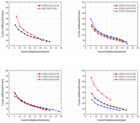 - The sinusoidal stiffness of the RC-2.0-0.3-C50 specimen was found to be higher than that of the CFST-2.0-0.3-C50 specimen during the early-to-mid stages of displacement loading. However, the stiffness of the RC-2.0-0.3-C50 specimen decreased more rapidly as displacement increased.