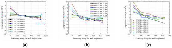 Figure 15 displays the strain in each specimen in Section 1. Positive loading resulted in tension in the left CFST column and compression in the right CFST column at yield, peak, and ultimate loads for the CRCSW-CFST specimens. The figure reveals that the strains in the CRCSW-CFST steel tubes were significantly higher compared to those in the vertical distribution reinforcements of the web, primarily due to slippage between the concrete slabs of the prefabricated web and the C-shaped steel.