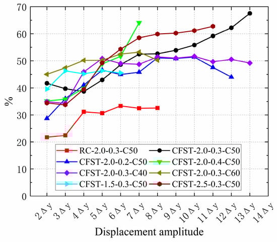 The equivalent viscous damper coefficient (he) is a crucial indicator for assessing the energy dissipation capacity of a structure and can be calculated using Equation (4). The higher values of improved the energy dissipation performance of the shear walls [43].