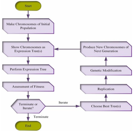 The genetic algorithm (GA) was developed by Holland [59] and was based on evolution of Darwin’s theory. A series of GAs demonstrates how the genetic process evolves, whereas fixed-length chromosomes show how it resolves. Koza and Koza [60] also proposed gene programming (GP) as an alteration to genetic algorithm (GA). GP is a versatile method for resolving issues that autonomously develops a model through the process of genetic evolution, without being restricted to any specific field [61]. GP is a flexible method because nonlinear structures like parse trees swap fixed-length binary strings. A developed machine intelligence program is based on certainly occurring genetic characteristics (i.e., mutation, reproduction, and cross-over) [62]. It handles reproduction-related issues following the Darwinian theory [37]. The goal of GP is to remove the programs that produce the lowest fitness during the reproduction phase. Trees at the execution stage are shown as the trees with the lowest fitness are terminated, and the remaining trees are used to replenish the population using the chosen mechanism. Nonetheless, the model’s early convergence is safeguarded by the process of evolution [62,63]. The GP approach specifies five key parameters: the set of crucial measurements and input parameters, basic domain functions, fitness evaluation, primary functional operators (population size, cross-over, etc.), and the outcomes are ascertained using the techniques employed for termination criteria [62]. Although GP generates a model automatically, a cross-over genetic processor generates the vast majority of the parse trees [60]. Creating nonlinear GP forms necessitates serving as a phenotype as well as a genotype, which results in complex expressions for desirable attributes [37].