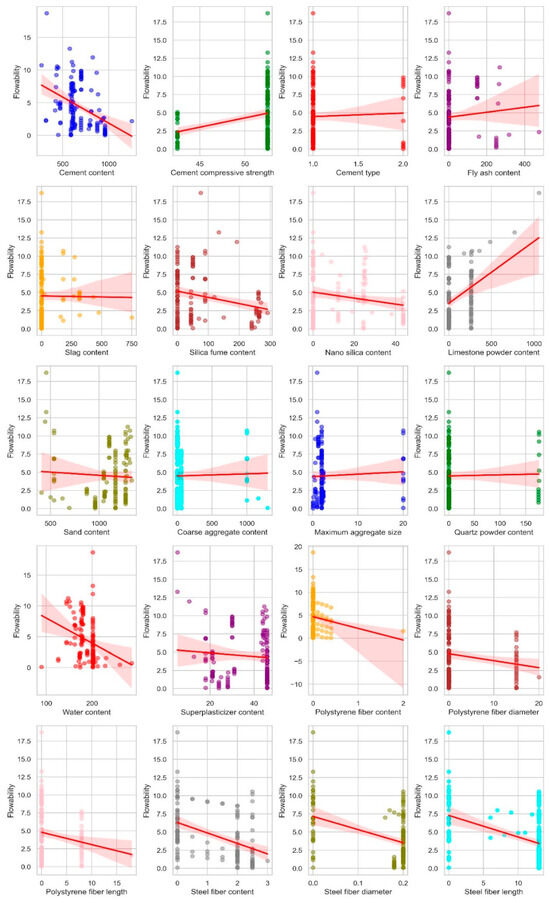 These findings illustrate that flowability in UHPC is influenced by a delicate balance of multiple ingredients, each contributing to the final workability in unique ways. The dataset seems well suited for creating predictive models of UHPC flowability, capturing the intricate interactions between UHPC components. Accurate prediction and optimization of flowability are critical for ensuring that UHPC can be effectively used in specialized applications, such as intricate formworks or structures where mechanical compaction may be challenging. Overall, the relationships between mix components and flowability presented in these plots provide valuable insights for advancing UHPC technology, ensuring that the concrete not only meets the high-performance criteria for strength and durability but is also practical to work with from a placement and finishing standpoint.