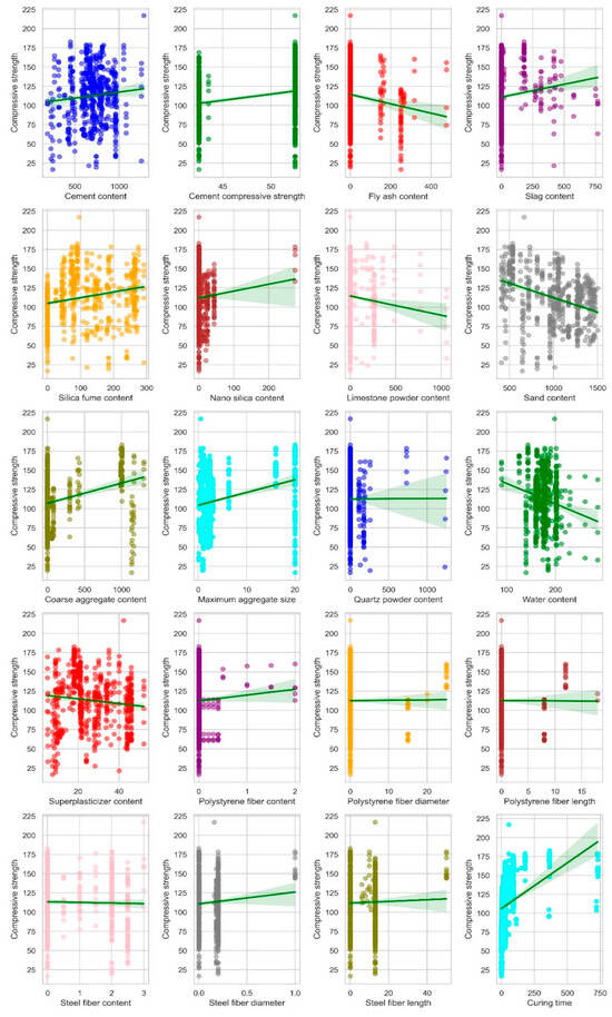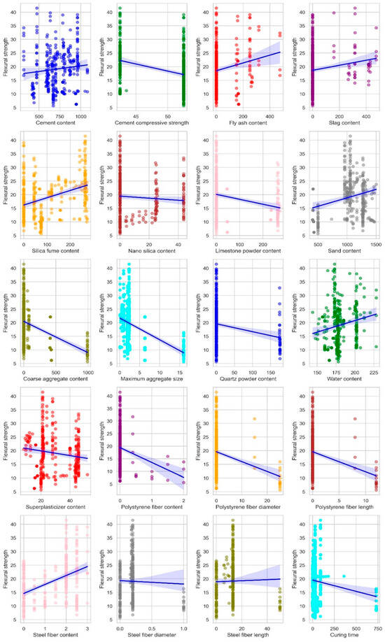 The UHPC dataset used for executing the algorithms for estimating its FS was obtained from the accessible literature [66]. A total of 21 input factors (Figure 5), i.e., fly ash content (kg/m3), cement content (kg/m3), silica fume content (kg/m3), nano-silica content (kg/m3), slag content (kg/m3), quartz powder content (kg/m3), sand content (kg/m3), limestone powder content (kg/m3), coarse aggregates content (kg/m3), diameter (mm), length (mm) and content (%) of steel fiber, super-plasticizers content (kg/m3), diameter (µm), length (mm), and content (%) of polystyrene fibers, cement type, water content (kg/m3), cement strength class, cement compressive strength (MPa), curing time (days), and maximum aggregate size (mm), are taken as output parameters for UHPC flexural strength.