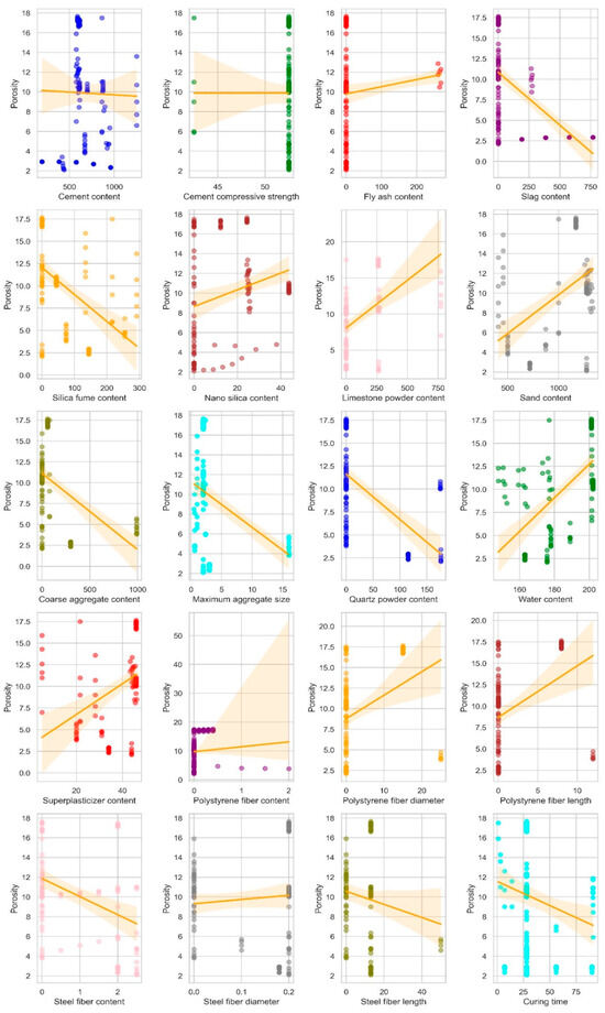 Data from the literature [66] were utilized to predict the porosity of UHPC. The dataset contains distinct combinations of the 21 input parameters (as shown in Figure 6). This dataset covers a variety of parameters, comprising cement (kg/m3), silica fume (kg/m3), fly ash (kg/m3), nano-silica (kg/m3), slag (kg/m3), limestone powder (kg/m3), quartz powder (kg/m3), coarse aggregates (kg/m3), maximum aggregate size (mm), super-plasticizers (kg/m3), sand (kg/m3), polystyrene fibers (%), steel fiber (%), water (kg/m3), compressive strength (MPa), strength class, and type of cement. It also includes dimensions like diameter (µm and mm) and length (mm) of steel and polystyrene fibers. Porosity (%) is the output characteristic determined using these input values.