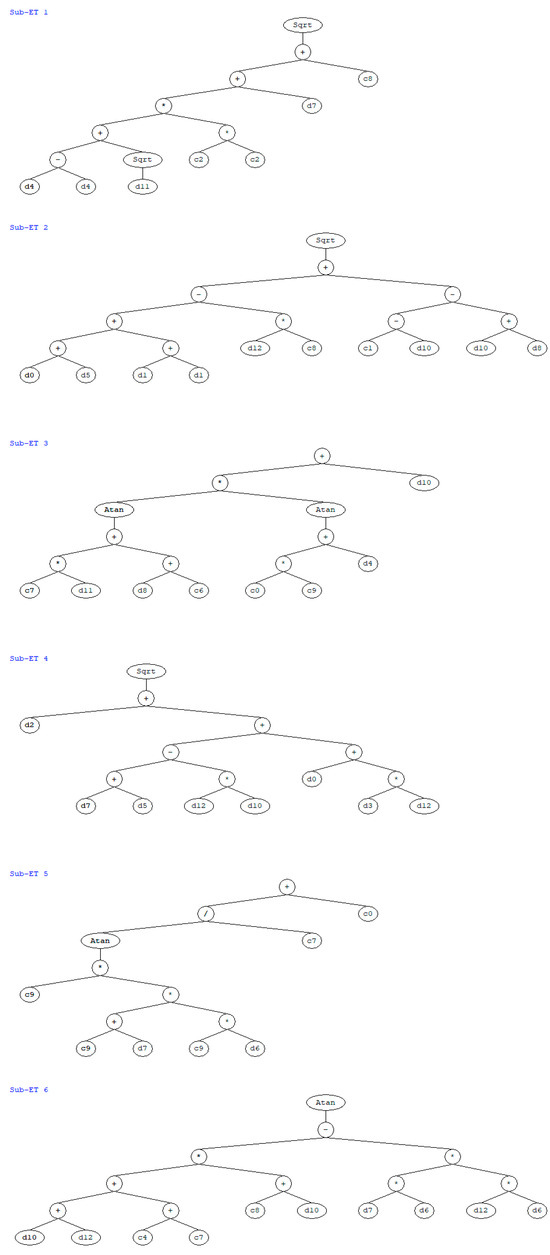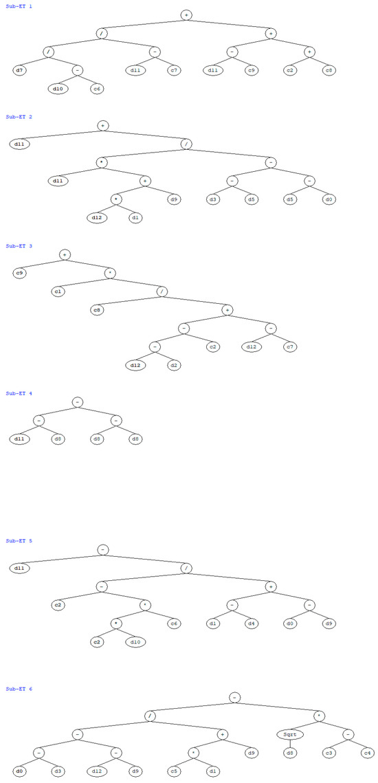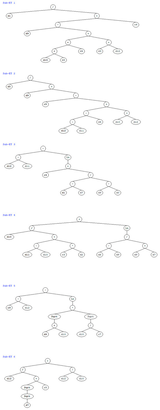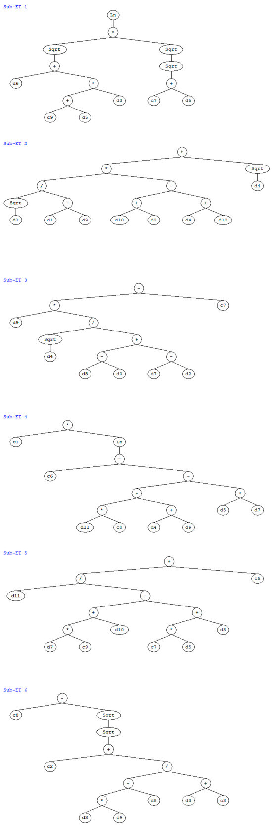 A normal chromosome is made up of its head and tail. Therefore, another amazing characteristic is the formation of things from a particular chromosome with many genes [62]. These genes include conditional functions, final sets, fixed-length variables, arithmetic operations, mathematical functions, and Boolean logic functions. A genetic code operator establishes a causal relationship between a cell and its associated function. These chromosomes include all of the information needed to produce empirical formulas, which are retrieved and deduced using a novel language called Karva. Beginning with Karva, the leading revolution moves through the expression tree (ET) with the string. According to Equation (1), when nodes are moved from the lowest layer to the bottom, ET records them [38]. The variation in the number of ETs can affect the scope of the GEP gene and the K-expression’s length.
