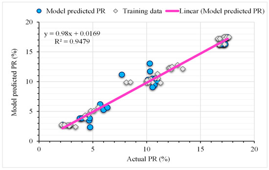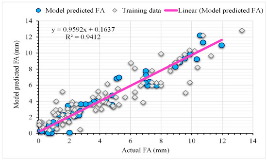 The development of models utilizing the GEP technique is in ET form, as shown in Figure 7, to collect mathematical correlations for FA calculations based on head size and chromosomal number. The FA’s sub-ETs mostly use the arithmetic operators +, –, x, ÷, and cubic root. The sub-ETs obtained using the GEP model are encrypted to yield the ultimate result, a mathematical formula. Equation (2), which uses these input parameters to forecast FA in the future, shows the mathematical conclusions for both output values. The developed model outperforms an ideal model under UHPC settings and has a large enough number of data points. The flowability regression lines of the training and validation sets’ experimental values are contrasted with the model’s predicted results in Figure 8. The regression lines’ slope indicates that the R2 value between the experimental and projected data is 0.94. The inclination of regression lines is about the same for training datasets that are near the perfect match (equals to 1). Figure 9 depicts a plot of the absolute error of the suggested GEP equation versus the experimental findings, providing an overview of the GEP model’s maximum error percentage. GEP equation’s results and the experimental results are almost identical, as seen by the reported minimum and maximum absolute error values of 0.021 and 1.94, respectively. The fact that maximum error frequencies are far less frequent must be noted.