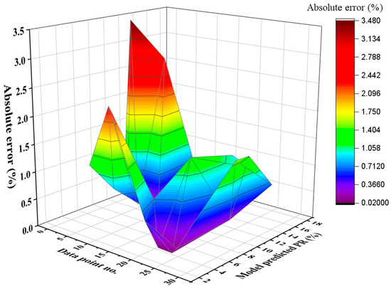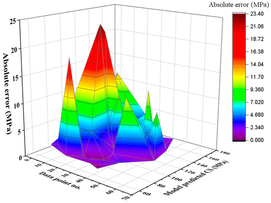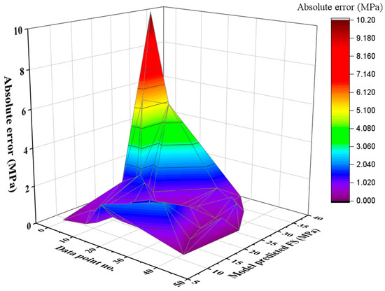 The compressive strength regression lines of the training and validation sets’ experimental values are contrasted with the model’s predicted results in Figure 14. It is clear that the regression lines’ slope indicates that the R2 between the experimental and anticipated values is 0.93. The inclination of the regression lines is about the same for the training datasets, which are near the perfect match (equals to 1). A plot of the absolute error of the proposed GEP equation against the experimental values is shown in Figure 15, which gives a general idea of the maximum error percentage of the GEP model. The absolute error values at the minimum and maximum were found to be 0.029 and 10.17, respectively, indicating a close match between the experimental results and the GEP equation’s output. The fact that maximum error frequencies are far less frequent must be noted.