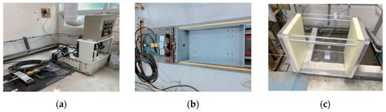 In this study, a model structure was created using the law of similitude (Iai, 1989) (Table 2) []. Type 3 (strain-softening) was chosen because the model ground used in this study is loosely formed, and the ground deformation is characterized by strain-softening, which persists even after the cyclic load ceases. The scale factor of the model structure relative to the prototype structure is denoted by λ, and is the scale factor for strain and is the scale factor for density.