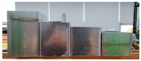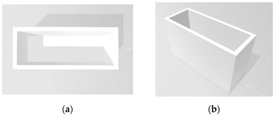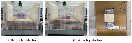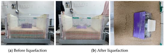 Jean (2006) noted that if the scaled ratio is less than 1/50, discrepancies may arise between the results of shaking table tests and numerical analyses. Therefore, this study selected a scaling ratio of 1/50 to facilitate a direct comparison between shaking table test results and numerical analysis. The model structure was constructed with a width, depth, and height of 250 mm, 100 mm, and 100 mm, respectively, and had a weight of 8 kg. The effective stress of the model structure was 3.136 kPa (Figure 9).