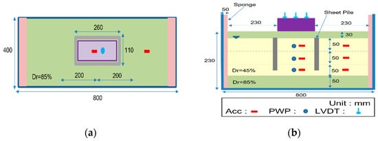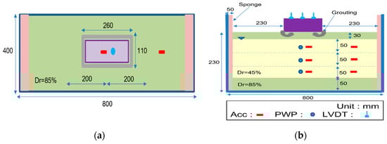 The rigid soil box, which formed the ground model, was constructed from acrylic with dimensions of 800 mm in length, 400 mm in width, and 700 mm in height. To absorb the impact caused by the input wave, Styrofoam, approximately 50 mm thick and made from woodlock material, was attached to two walls of the rigid soil box.