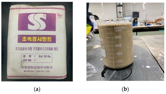 In general, grouting chemicals are prepared using a blend of cement powder, chemical mixtures, and water to control the injection and solidification rates in the ground. However, in this study, grouting chemicals were manufactured using ultrafast cement without any additional chemical mixtures. Ultrafast cement has the advantage of a much shorter setting time compared to conventional cement, achieving a compressive strength of over 20 MPa within 3 h. Additionally, its finer particle size allows for effective low-pressure penetration (see Figure 5).