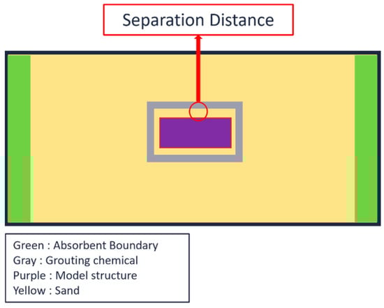 Additionally, to assess the impact of the separation distance between the grouting injection point and the structure (as illustrated in Figure 6), tests were conducted with grouting chemicals injected at varying points. The separation distance refers to the distance between the structure and the location where the grouting chemicals are injected. The purpose of varying the separation distance was to determine how the reinforcement effect on the structure changes depending on the injection location (see Figure 6). Figure 7 provides a schematic diagram of the grouting setup.