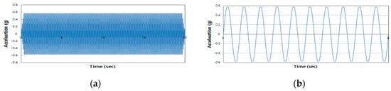 Input motion at 0.6 g, 10 Hz, 1000 cycles: (a) the whole vibration test; (b) input wave.
