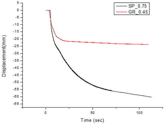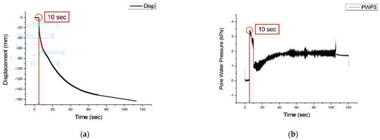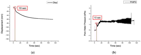 Approximately 5–7 s after the cyclic load began acting on the ground, the structure rapidly settled to a final depth of 23 mm. This represents an 85% reduction compared to the untreated ground, demonstrating that grouting is effective in suppressing structural settlement (Figure 19).