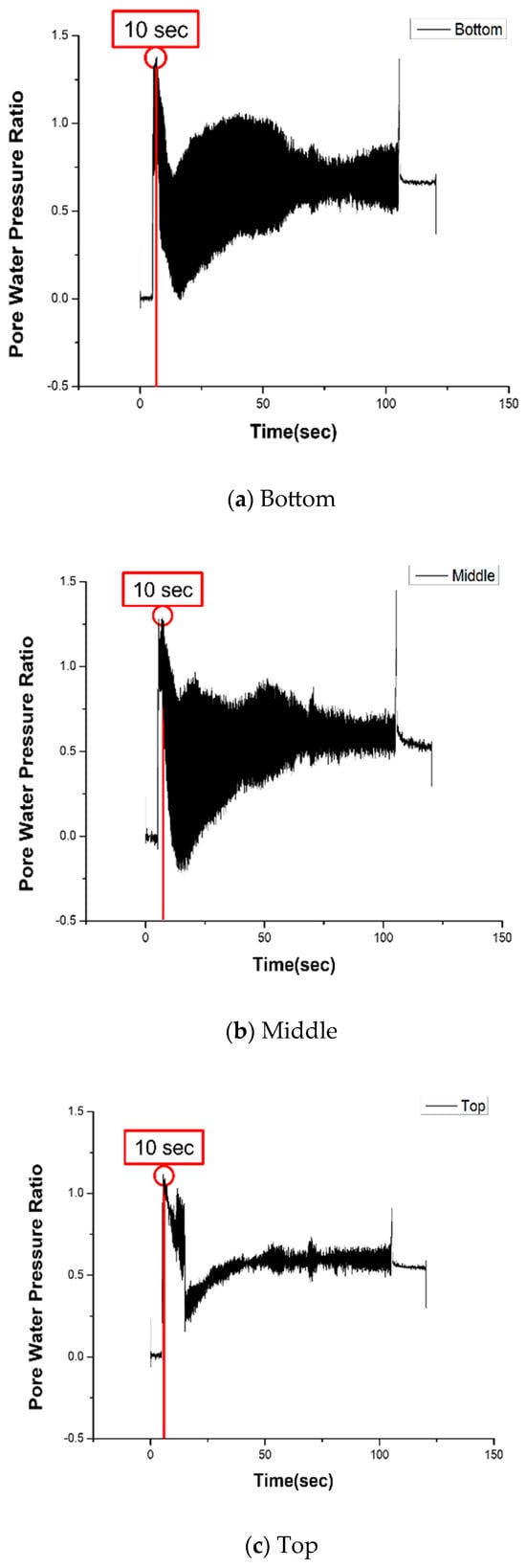 Testing with various input waves showed that ground liquefaction occurred at an acceleration of 0.6 g and a frequency of 10 Hz, which were applied as the input wave conditions (Figure 8).