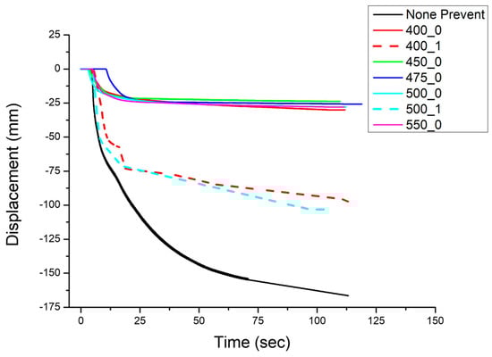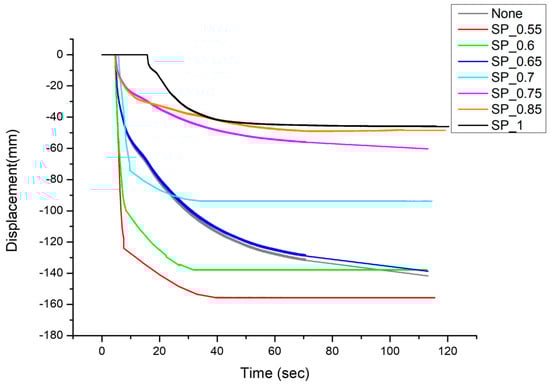 As shown in Figure 15, the settlement of the structure was triggered by the input wave acting on the model ground. After approximately 10 s, the model structure experienced rapid settlement, reaching a final value of 60 mm. This represents a reduction of approximately 79% compared to the control ground with no prevention method.