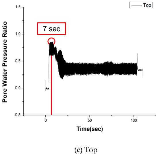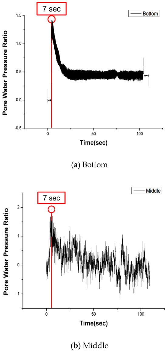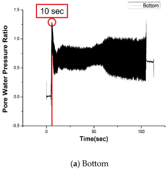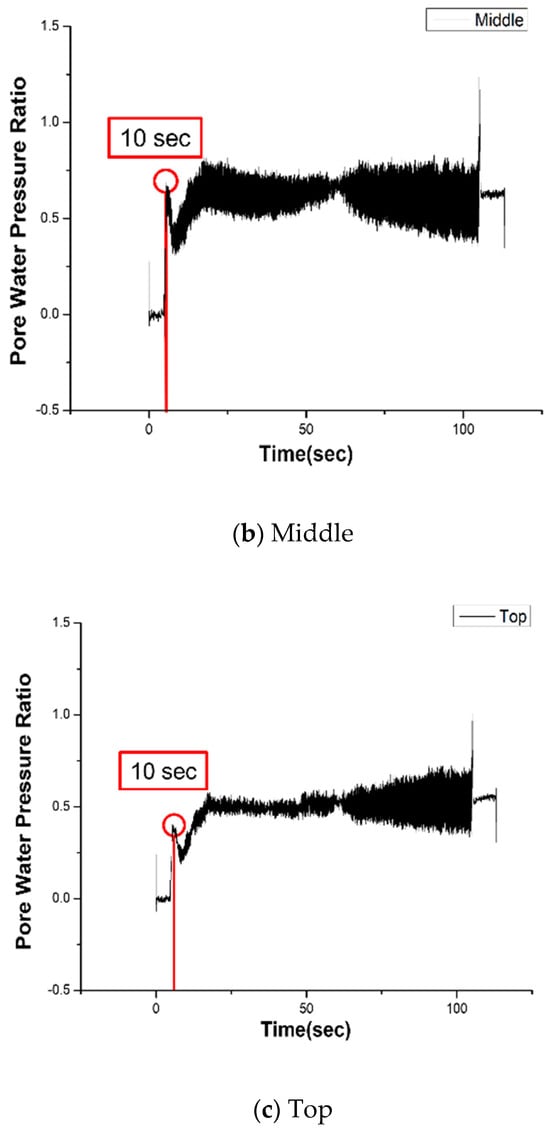 Measurements indicated that the model structure began to settle significantly about 10 s after the cyclic load was applied, reaching a maximum vertical settlement of 162 mm. During this period, the pore water pressure in the ground was also at its peak (Figure 11). This suggests that the rapid rise in excess pore water pressure, caused by cyclic loads acting on the saturated loose sand layer is the primary factor in the loss of effective stress and liquefaction. As the pore water pressure rises swiftly, the ground strength diminishes. The pore water pressure ratio, calculated from the effective stress of the structure and the measured pore water pressure, exceeded 1, indicating that the rapid increase in pore water pressure was the primary cause of liquefaction (Figure 12).