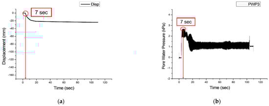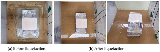 Figure 10 compares the control ground model, which had no prevention method applied, before and after liquefaction. The test results revealed that when a cyclic load was applied to the model ground, the pore water pressure increased, as shown in Figure 10b. This led to a loss of effective stress and subsequent liquefaction of the ground. The model structure experienced rapid vertical settlement and rotation due to differential settlement.