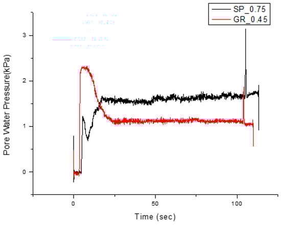 Test results indicate that the grouting method reduces settlement by approximately 30% compared to the sheet pile method (Figure 21). This reduction can be attributed to the increased ground strength achieved through grouting, which effectively suppresses structural settlement. However, during liquefaction, the sheet pile method recorded a maximum pore water pressure of approximately 1.25 kPa, while the grouting method recorded a maximum of approximately 2.6 kPa. This represents a 52% reduction, suggesting that the sheet pile method was more effective in mitigating increases in pore water pressure compared to the grouting method (Figure 22). This difference is likely because the grouting method requires a smaller area for ground reinforcement than the sheet pile method.