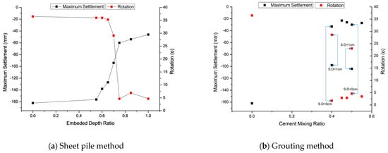 Additionally, a relationship equation for each method was proposed using settlement data corresponding to the embedded depth ratio of the sheet pile and the grouting chemical mixing ratio.