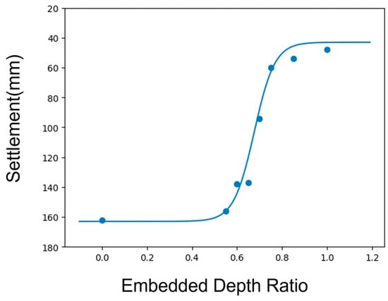 In the above equation, a affects the slope of the curve, b affects the position of the x-axis of the function, c affects the peak position of the curve, and d affects the length of the y-axis of the curve. Based on Figure 25, the following relationship equation for the embedded depth ratio and settlement of the sheet pile was derived.