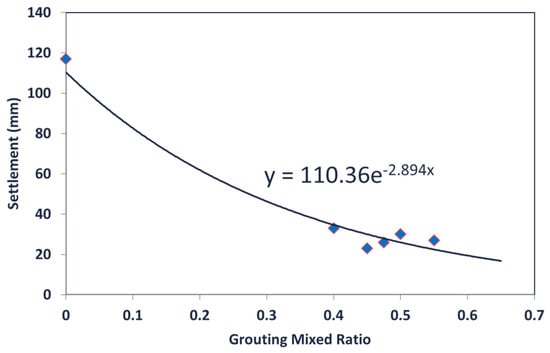Additionally, the relationship between the grouting chemical mixing ratio and the settlement of the structure was proposed as a Log function using Figure 26.