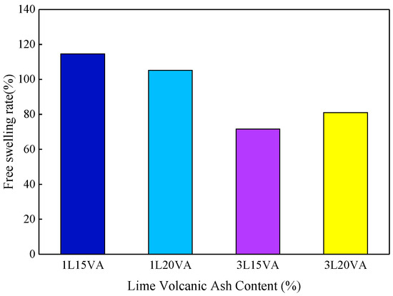 Free swelling rate of BCS with different blending amounts of lime and volcanic ash. (Note: L indicates lime, VA is volcanic ash, 1 is 1% content, 15 is 15% content, and the rest of paper is the same).