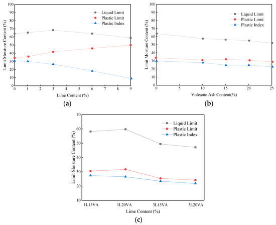 Limit moisture content of BCS with different blending amounts of (a) lime, (b) volcanic ash, and (c) lime volcanic ash.