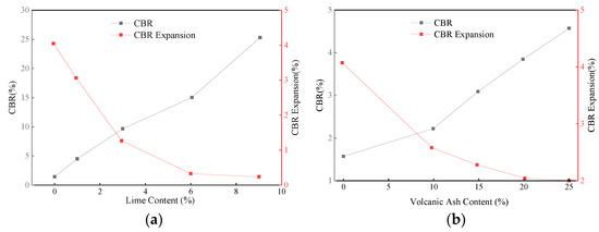 CBR test and CBR expansion test were conducted to evaluate the effect of additives on strength properties, as well as to recommend an optimum content of additive. Testing results are presented in Figure 5. As noted, the CBR value increases steadily with the increase in lime content or volcanic ash, with an increase in growth rate, which is consistent with the conclusions drawn by Li [12]. In contrast, the CBR expansion capacity decreases gradually at the beginning and tends to plateau. It is also observed that the CBR value is more sensitive if lime is utilized compared to the volcanic ash. It is also noted that if the mixture of lime and volcanic ash are both added, the CBR value is significantly increased and CBR expansion rate is greatly reduced, compared to the sole addition of lime or volcanic ash. This provides an option to utilize more volcanic ash since the price of lime in local East Africa is high.
