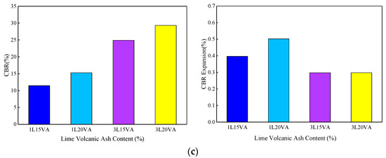 CBR value and CBR swelling capacity of BCS with blending amounts of (a) lime, (b) volcanic ash, and (c) lime volcanic ash.