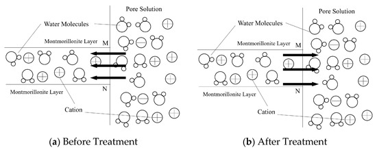 After treatment with a mixture of lime and volcanic ash, a large number of cations flowed into the pore solution. The concentration of ions in the pore solution increased significantly, and the solutions in the pores and between the montmorillonite layers are shown in Figure 7b. The ion concentration between the layers was smaller than the pore solution; thus, the osmotic pressure difference caused the water molecules to enter the pore solution from the intercrystalline layer (as shown in Figure 7b). The spacing of montmorillonite decreases and contracts, which can reduce the expansion potential of BCS.