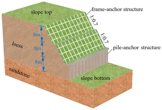The prototype slope is a three-stage slope with each stage being 8 m, as shown in Figure 1. The reinforcement design adopts the combination support structure of a pile-anchor and a frame-anchor. The bottom level of the slope is reinforced with a pile-anchor structure. The spacing between piles is 2.5 m, and the pile length is 15 m. Two layers of anchor rods with a length of 12 m are installed on the pile. The upper two levels of the slope are reinforced with a frame-anchor structure. Each level has three layers of anchor rods, and the longitudinal and transverse spacing of the anchor rods are 2.5 m. The length of the anchor rods located in the middle level is 14 m. The length of the anchor rods located at the top is 16 m. The geological composition is loess and sandstone, with loess being in part of the slope, and sandstone being in the underlying strata. The specific geotechnical parameters are shown in Table 1.