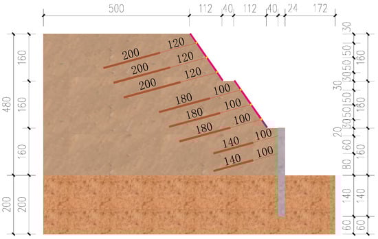 After considering the scale of the prototype slope, the size of the model box, and the difficulty of making structural components, the similarity ratio for this test was determined to be n = 50. According to this similarity ratio, the height of the scaled slope obtained was 480 mm. Other dimensions are shown in Figure 3.