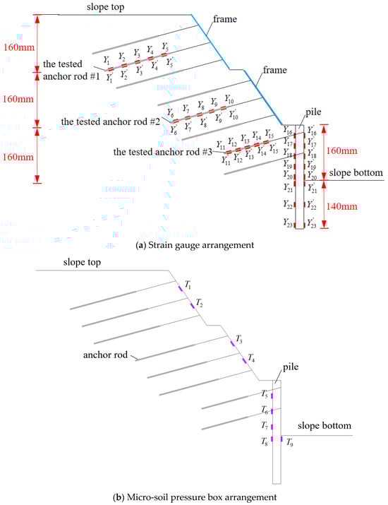 This test mainly monitors the structure force and slope deformation. To avoid model boundaries adversely affecting the test results, the sensors should be located away from the sidewalls of the model box. Considering the size effect of sensors and the intersection of circuits, it was ultimately decided to arrange two monitoring profiles. Profile 1 was located at the 6th column structure and was mainly used for arranging strain gauges, as shown in Figure 5a. The frame–anchor support section included two test anchor rods, and the pile-anchor support section included one test anchor rod. The anchoring section of each anchor rod was uniformly and symmetrically pasted with 5 pairs of strain gauges. The support pile had eight pairs of strain gauges symmetrically pasted on it. According to the data measured by strain gauges, the distribution and variation of anchor rod axial force and support pile bending moment during centrifugal loading could be obtained. Profile 2 was located at the 7th column support structure and was mainly used for arranging soil pressure boxes, as shown in Figure 5b. Micro-soil pressure boxes were installed around the support pile and on the inner side of the frame beams, numbered T1–T9 from top to bottom. T1–T2 were located in the upper frame–anchor support section, T3–T4 were located in the middle level frame–anchor support section, and T5–T9 were located in the lowest level pile–anchor support section. According to the measured data of the soil pressure box, the distribution and variation rule of soil pressure acting on the frame and pile during centrifugal loading could be obtained. In addition to the arrangement of strain gauges and soil pressure boxes, displacement monitoring points were also set on the slope. Based on the data obtained from displacement monitoring points, the deformation and failure of the slope during centrifugal loading could be obtained.