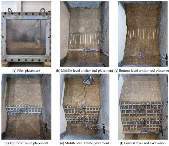 The main steps in making a scaled model are as follows: (1) Draw reference points inside the model box based on the size of the model slope, providing a benchmark for model filling. (2) Apply silicone oil inside the model box to reduce the influence of boundary effects. (3) Fill the geotechnical materials, layer by layer, according to the slope shape and anchor rod position. The depths of filling were 100 mm, 100 mm, 80 mm, 60 mm, 50 mm, 50 mm, 50 mm, 60 mm, 50 mm, 50 mm, 50 mm, and 30 mm in sequence. The density was strictly controlled during model soil filling. During the sandstone fill stage, position and secure the scaled piles. During the loess-filling stage, when the soil is filled to the corresponding height of each layer of anchor rods, the soil within the designated area for anchor placement is excavated. After placing the anchor rods, the excavated soil is re-compacted, and then the soil surface is loosened to facilitate the subsequent filling of the next layer of soil. This process is repeated until the design elevation is reached. (4) Excavate the soil according to the designed slope ratio, and position the scaled frame structure simultaneously. (5) Set small markers with a spacing of 50 mm × 50 mm on the top surface and cross-section of the slope to observe slope deformation. The centrifugal model production process and final model are shown in Figure 6.