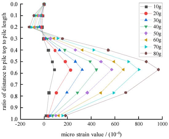The strain values were distributed in an upward convex shape along the axial direction of the anchor rods, as shown in Figure 12. At the same acceleration, the strain of the tested anchor rod #2 was greater than that of the tested anchor rod #1. This indicates that the soil pressure in the middle of the slope was greater than that in the upper part of the slope, and this conclusion is consistent with the results of the soil pressure analysis. At different loading stages, the maximum axial strain was located at different monitoring points. When the acceleration was small, the maximum strain was located at the second monitoring point. When the acceleration reached 80 g, the maximum strain was located at the fourth monitoring point. This indicates that the lateral frictional resistance at the end of the anchor rods occurred first and then gradually extended outward. Slope displacement can be revealed by analyzing the lateral friction resistance of the anchoring section. Within the range of the left and middle ends of the anchoring section (between measurement points 1 and 4 in the Figure), the strain value gradually increased. This indicates that the anchor rods within this range were moving outward relative to the soil. Within the range of the right end of the anchoring section (between measurement point 4 and measurement point 5 in the Figure), the strain value gradually decreased. This indicates that the soil within this range was moving outward relative to the anchor rods. At the same time, the growth rate of axial strain from measurement point 1 to measurement point 4 gradually decreased, which is different from the force characteristics of anchor rods anchored in rock layers or absolutely stable soil layers. This indicates that the support structure affected the deformation range of the slope, and the anchor rod was not located in a stable soil layer.