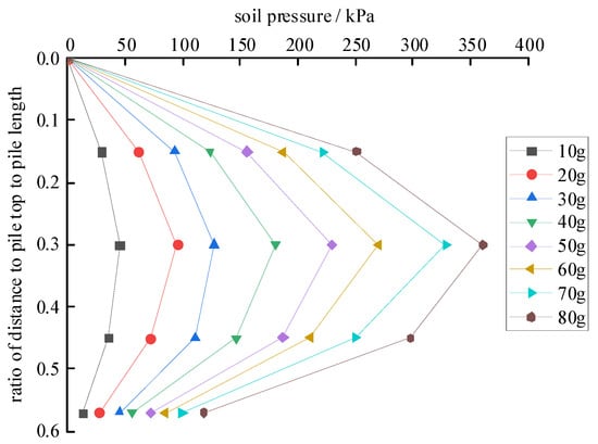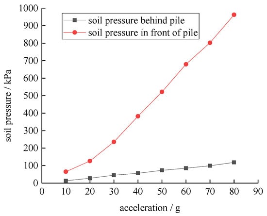 The soil pressure on the pile at the foot of the slope is shown in Figure 9. With the increase of centrifugal acceleration, the soil pressure in front of the pile increases very quickly, which indicates that the pile has tilted forward, while the soil pressure behind the pile at the foot of the slope under the influence of the pile deformation increases to a lesser extent.