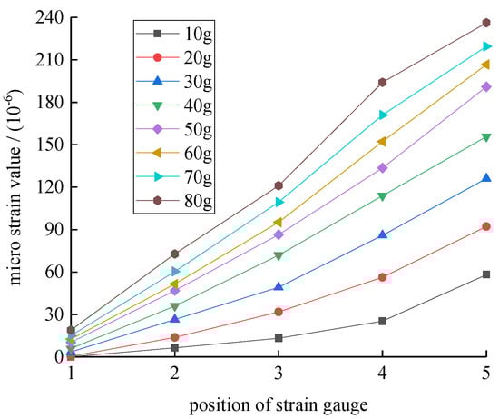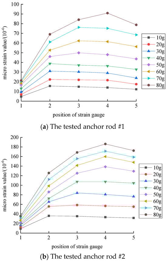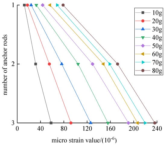 For anchor rods, the axial force at the measuring point is proportional to the axial strain, so the distribution of axial force can be analyzed through axial strain. The specific axial strain value can be calculated according to Equation (2). The calculated axial strain and its variation with acceleration are shown in Figure 10.
