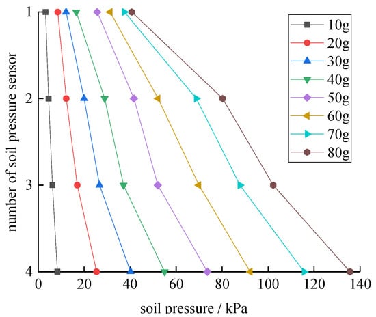 The distribution of soil pressure on the frames and its variation with acceleration are shown in Figure 11. Measurement points 1 and 2 are located on the soil side of the upper level frame column, while measurement points 3 and 4 are located on the soil side of the middle level frame column. The distribution law of soil pressure can indirectly reflect the displacement of the slope and the force on the anchor rod. Usually, the greater the soil pressure, the more obvious the displacement trend at that position, and the corresponding force on the anchor rod is also greater. Therefore, the foot of the middle level of the slope is where the frame-anchor support section is displaced the most, as well as where the entire supported slope is displaced the most.