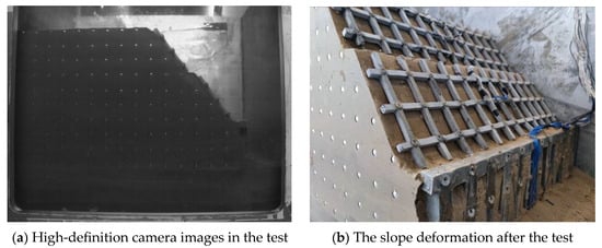 The high-definition camera of the centrifuge is shown in Figure 14a, and the deformation of the slope is shown in Figure 14b. The combination support structure of pile-anchor and frame-anchor had a significant reinforcement effect on multi-level soil slopes during centrifugal loading. The slope did not experience instability with increasing loading, and the deformation remained relatively slow. When the acceleration value reached 80 g, the vertical settlement at the top of the slope was about 2 mm, and the soil between the piles partially fell off. The frame-anchor support section experienced displacement, but the displacement was relatively small. The displacement of the pile-anchor support section was the smallest. Although there was no obvious sliding deformation zone, the potential deformation range of the slope can be analyzed by the force situation of the anchor rod. Combined with the results of force analysis of the tested anchors in Section 3.1 and Section 3.2, it can be seen that the anchor rods were located within the displacement zone, and the actual displacement zone of the slope was relatively large.