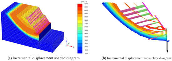 In order to verify the test results and clarify the deformation range of the slope, finite element software PLAXIS 3D was used to simulate the test slope. In the finite element model, the soil material was simulated by the Mohr–Coulomb model, the frame beam was simulated by conventional beam unit, the pile was simulated by plate unit, and the anchored section and free section of the anchor were simulated by embedded pile and point-to-point anchor, respectively. The incremental displacement obtained from the simulation reflected the deformation of the slope, so the slope incremental displacement was used to analyze the position of the slope sliding surface and the relative displacement in the sliding area. Figure 15a shows the incremental displacement shaded diagram, and Figure 15b shows the incremental displacement isosurface diagram. The Figure shows that the slope deformation range is large, and all the reinforced areas are within the deformation zone. The displacement of the intermediate level of the slope is obviously larger than that of the other two levels, and the largest displacement occurs at the foot of the intermediate level. When slope instability occurs, the slope may slide as a whole along the end of the anchored section and at the toe of the slope. It can be seen that the numerical simulation results are consistent with the conclusion that the anchor rods are all located within the deformation zone obtained from the tests.