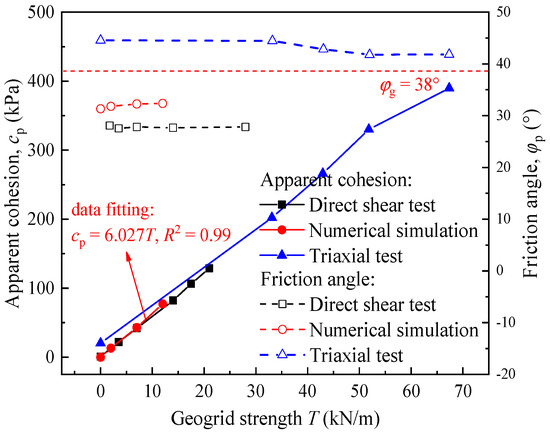 As the results of the laboratory shear tests [12] revealed, apparent cohesions of GESCs increase linearly with the tensile strength of the geosynthetic encasements, whereas their friction angles are little influenced and remain constant. The results of the laboratory triaxial tests [26] also come to similar conclusions, as shown in Figure 2. Therefore, the apparent cohesions of GESCs can be calculated by the tensile strength of geosynthetic encasements (in the vertical direction), and their friction angles remain constant, matching those of stone columns, as shown in Equations (1) and (2).