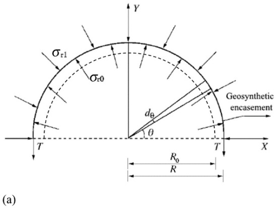 where εr is the radial strain of the geosynthetic encasement at tensile failure, and the corresponding tensile force is close to the available geogrid strength, which can be regarded as equal to the geogrid strength (T) under ideal conditions. For simplicity, the creep effect is not considered in this study. There exists a force equilibrium in the geosynthetic encasement at the Y-axis direction: