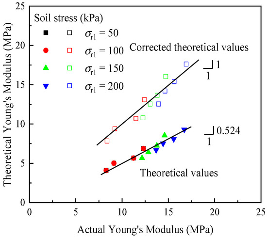 To validate the equivalent Young’s modulus of GESC, the theoretical results (solved by Mathcad 15.0) were compared with the test results by existing triaxial tests [26]. As Figure 4 shows, with a correction coefficient of κ = 1.91, the theoretical values align well with the actual values. Therefore, the equation for calculating the theoretical Young’s modulus is further corrected as follows: