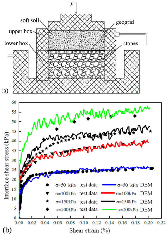 Additionally, interfaces were created between two different materials, such as GESC–soft soil, GESC–embankment fill, GESC–bedrock, and so on. The interface parameters were adopted referring to the existing interface shear test conducted by Zhang et al. [34], as shown in Figure 5a. The upper and lower shear box was filled with soft soils and stones, respectively. The geogrid sample was placed between the stones and soft soils, with its four corners fixed in the lower box using steel bars. The shear properties of the GESC–soft soil interface were investigated and further replicated through numerical simulation. The results (Figure 5b) showed that the friction angle of the interface increased with the stiffness of the GESC, while the cohesion of the interface was little influenced. Specifically, the stiffness parameters (including normal and shear stiffness) of interfaces can be calculated by Equation (12), and the cohesion and friction angle of the interfaces were determined to be 0.8 times the values of the involved materials, as they were relatively insignificant to the test results.