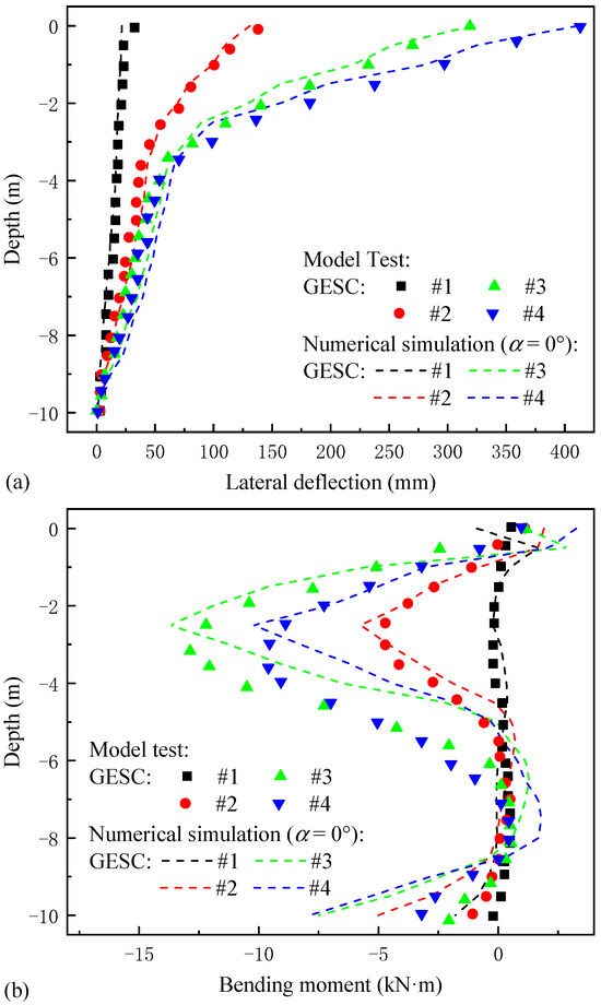 To verify the sloped GESC composite foundation model, the numerical results (i.e., the lateral displacements and bending moments experienced by GESCs) were compared with the laboratory test results [11], as shown in Figure 6. High consistency can be observed in the lateral displacements of GESCs between the test results and the numerical simulations. Simultaneously, the bending moment distributions along the depth of GESCs are nearly identical, with only minor differences in magnitude. The observed discrepancies occur near the bottom of the model and can be attributed to boundary-condition errors. Specifically, in the FEM model, the bottom boundary is fixed horizontally, which cannot be fully realized in the laboratory test due to the limited friction between GESCs and the bottom boundary. This discrepancy leads to overestimated bending moments near the bottom and underestimated moments further from the bottom. However, these errors remain within an acceptable range. Despite this, there is still a good consistency between the test results and numerical simulations, confirming the rationality of the equivalent modeling method for GESCs and the accuracy of the FDM model, which is suitable as a baseline case for the subsequent stability analysis.
