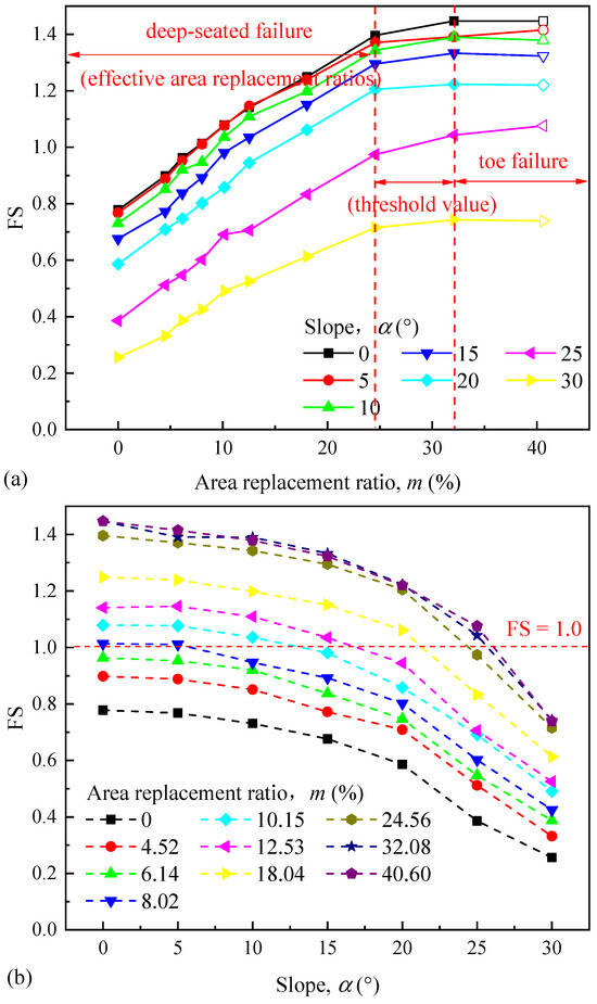 The effect of area replacement ratio (m) on the stability of sloped GESC composite foundations was investigated under different foundation slopes (α), as shown in Figure 7a. In general, the FS value increases nonlinearly with the area replacement ratio regardless of foundation slopes. Specifically, when the area replacement ratio is relatively low, there exhibits an approximately linear positive relationship between the FS and the area replacement ratio. However, when the area replacement ratio continually increases and exceeds a certain threshold (m > 24.56% in this study), the increase in the FS significantly reduces. To further figure out the impact of a high area replacement ratio on the slope stability, an additional case with a high area replacement ratio of m = 40.60% was added into the analysis (included in Figure 7a). It could be found that slope stability gradually approaches the maximum value and tends to be constant.