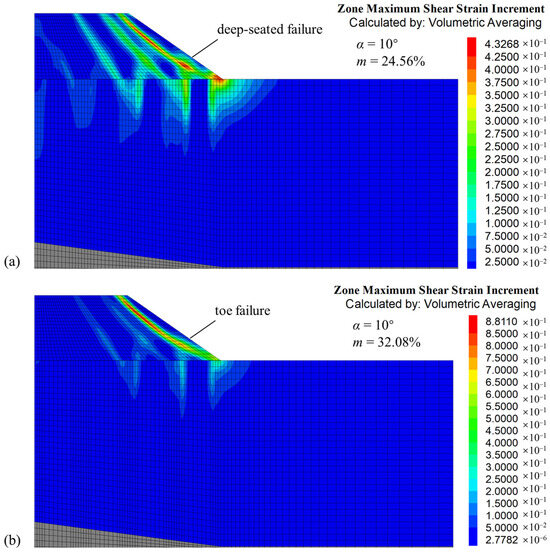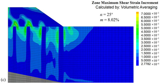 To explain this phenomenon, the distribution of maximum shear-strain increments was captured from the numerical analysis in the critical instability state of various sloped GESC composite foundations. The distribution represents the development of the continuous plastic zones, indicating the locations of potential slide surfaces. For instance, consider the two cases with area replacement ratios of m = 24.56% and m = 32.08% under the same foundation slope (α = 10°), as illustrated in Figure 8a,b. It is found that the failure mode of the sloped GESC composite foundation shifts from the deep-seated failure (Figure 8a) to the toe failure (Figure 8b). It means the primary factor controlling the overall stability of the model changes from the shear strength of the composite foundation into that of the embankment at a certain point (i.e., area replacement ratio between m = 24.56% and 32.08%). Consequently, further increasing the area replacement ratio beyond the point could effectively enhance the composite foundations, but it does not significantly benefit the overall stability of the sloped GESC composite foundation and its overlying embankment.