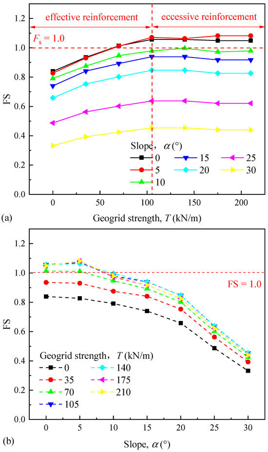 Relationship between FS and (a) geogrid strength; (b) foundation slope.